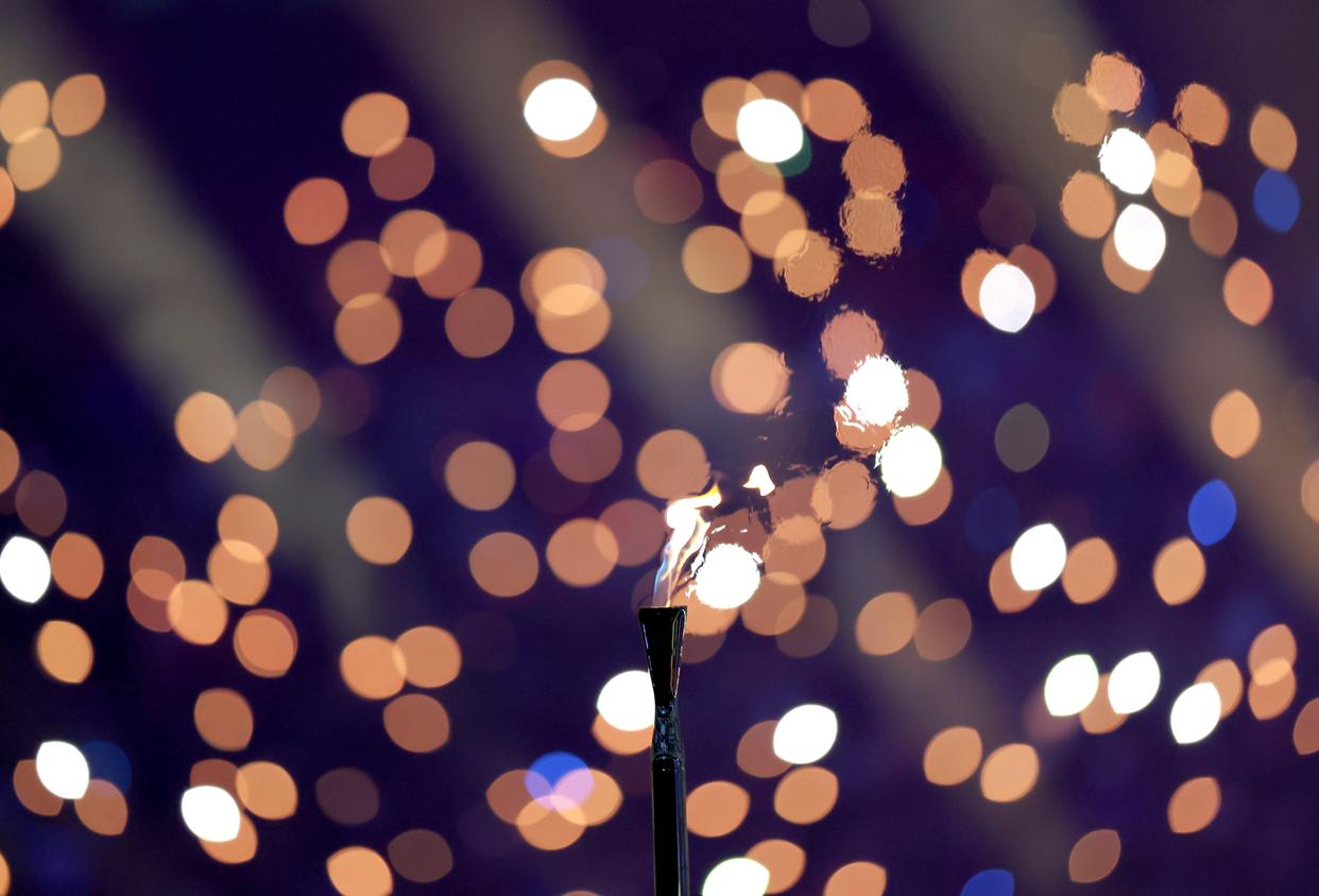 这是2月6日在开幕式现场传递的冬奥火炬。 当地时间2月6日,2026年米兰-科尔蒂纳冬奥会开幕式在意大利米兰圣西罗体育场举行。 新华社记者 李明 摄