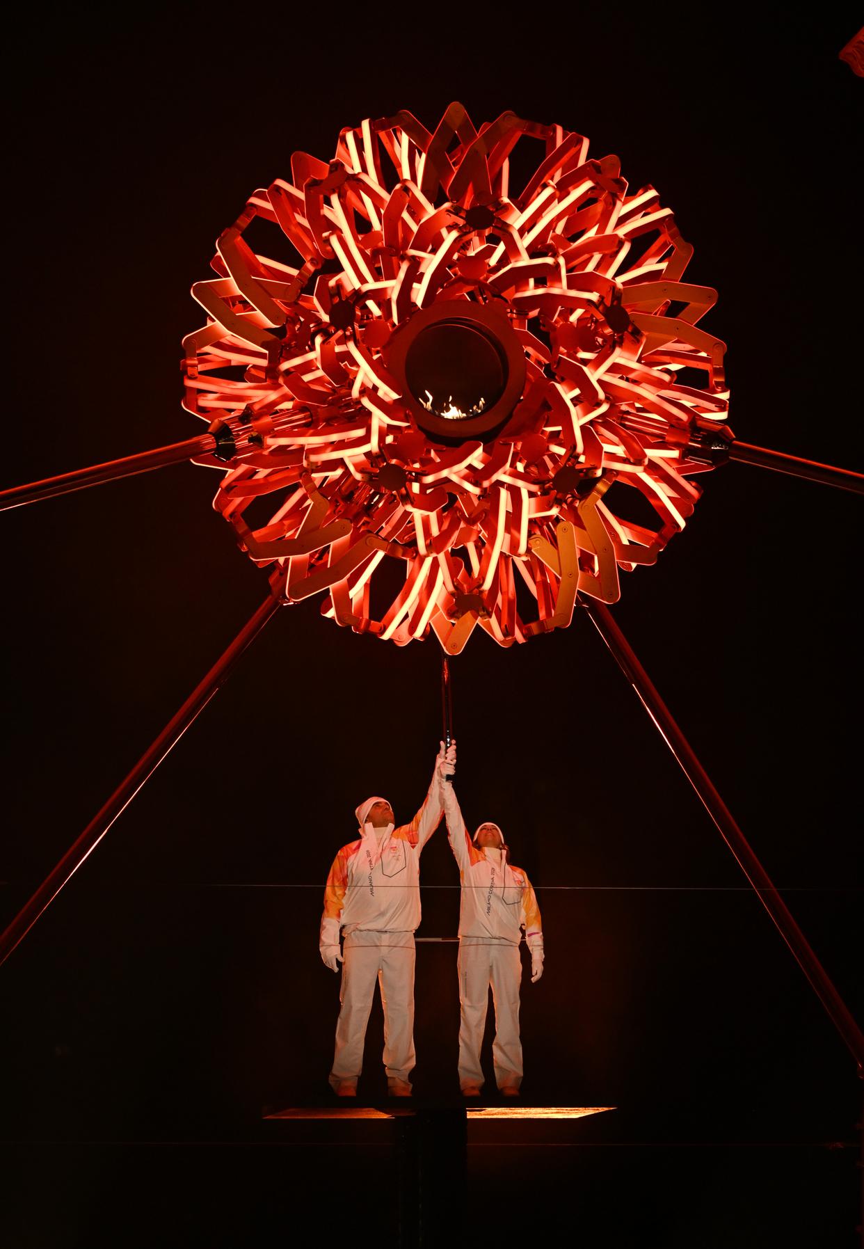 2月6日,在米兰和平拱门,火炬手孔帕尼奥尼(右)和通巴点燃主火炬。 当地时间2月6日,2026年米兰-科尔蒂纳冬奥会开幕式在意大利米兰圣西罗体育场举行,冬奥会主火炬在米兰和平拱门与科尔蒂纳迪博纳广场同步点燃。 新华社记者 武巍 摄