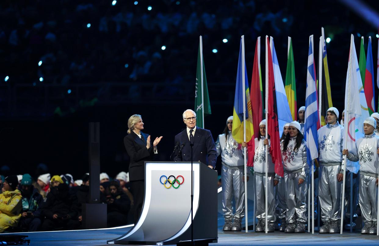 2月6日,米兰-科尔蒂纳冬奥会组委会主席乔瓦尼·马拉戈(前右)在开幕式上致辞。 当地时间2月6日,2026年米兰-科尔蒂纳冬奥会开幕式在意大利米兰圣西罗体育场举行。 新华社记者 李京 摄