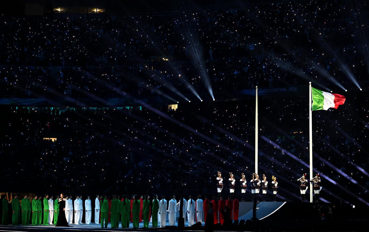 2月6日,意大利国旗在开幕式上升起。 当地时间2月6日,2026年米兰-科尔蒂纳冬奥会开幕式在意大利米兰圣西罗体育场举行。 新华社记者 李京 摄