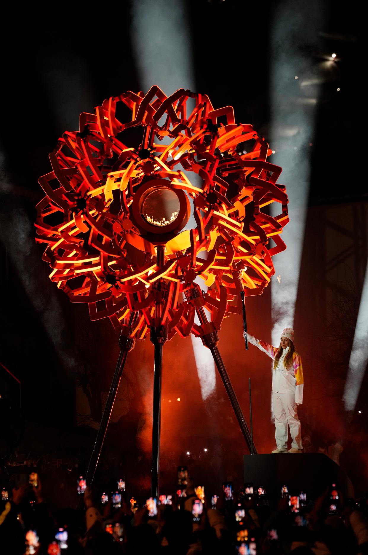 2月6日,在科尔蒂纳迪博纳广场,火炬手点燃主火炬。 当地时间2月6日,2026年米兰-科尔蒂纳冬奥会开幕式在意大利米兰圣西罗体育场举行,冬奥会主火炬在米兰和平拱门和科尔蒂纳迪博纳广场同步点燃。 新华社记者 李钢 摄