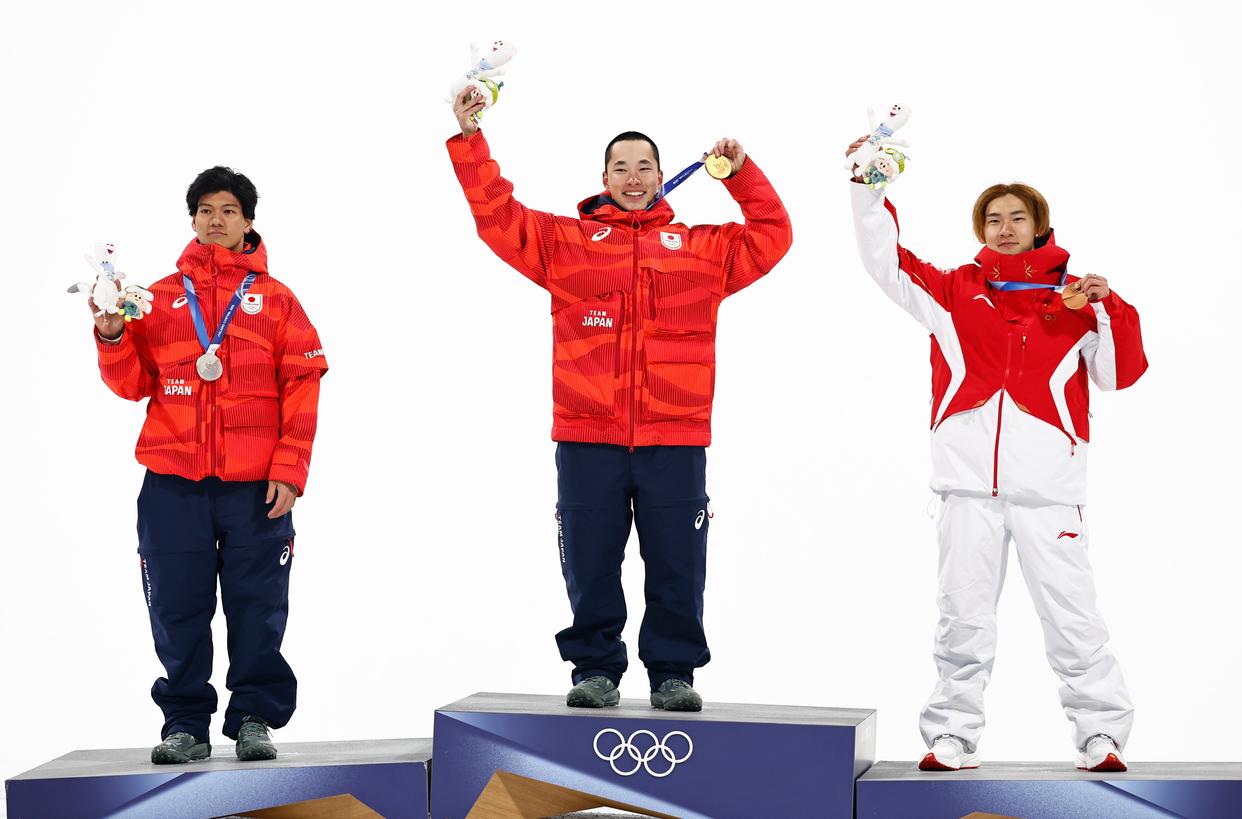 2月7日,冠军日本选手木村葵来(中)、亚军日本选手木俣椋真(左)和季军中国选手苏翊鸣在颁奖仪式上。新华社记者 王鹏 摄