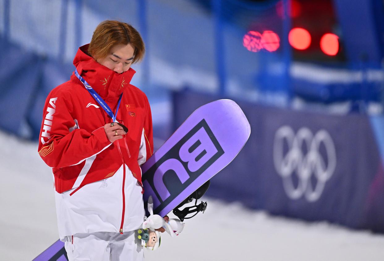 2月7日,苏翊鸣在颁奖仪式后查看奖牌。新华社记者 张宏祥 摄
