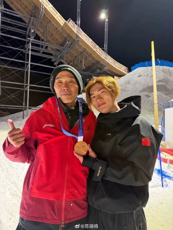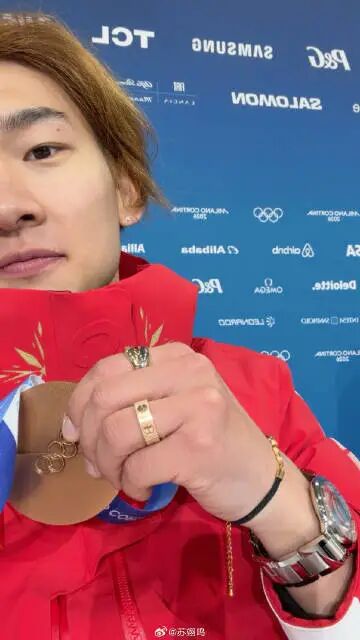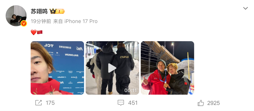 2月8日,@苏翊鸣在个人社交平台晒出比赛照片和视频,配文爱心和五星红旗。