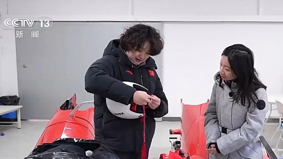雪橇运动员 周梁子婷:这是滑行用的雪橇,我们采用仰躺着的滑行姿势,一共有三个发力点:肩、把手、橇头。滑行时都是依靠重心转换,在弯道进行发力。眼睛是看前面的,但是基本上也不会去看。头不能抬太高。一般可能会看到赛道上面的1/2、1/3。如果我的头越高,我的风阻越大,我滑得就越慢。