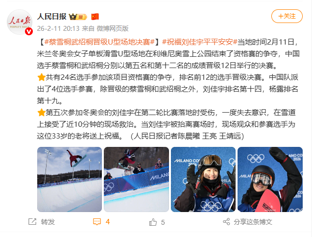 当地时间2月11日,米兰冬奥会女子单板滑雪U型场地在利维尼奥雪上公园结束了资格赛的争夺,中国选手蔡雪桐和武绍桐分别以第五名和第十二名的成绩晋级12日举行的决赛。
