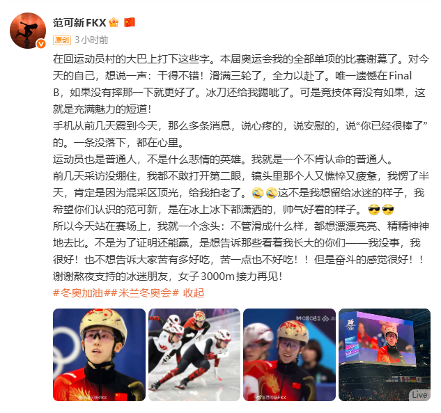 手机从前几天震到今天,那么多条消息,说心疼的,说安慰的,说“你已经很棒了”的。一条没落下,都在心里。运动员也是普通人,不是什么悲情的英雄。我就是一个不肯认命的普通人。前几天采访没绷住,我都不敢打开第二眼,镜头里那个人又憔悴又疲惫,我愣了半天,肯定是因为混采区顶光,给我拍老了。这不是我想留给冰迷的样子,我希望你们认识的范可新,是在冰上冰下都潇洒的,帅气好看的样子。所以今天站在赛场上,我就一个念头:不管滑成什么样,都想漂漂亮亮、精精神神地去比。不是为了证明还能赢,是想告诉那些看着我长大的你们——我没事,我很好!也不想告诉大家苦有多好吃,苦一点也不好吃!!但是奋斗的感觉很好!!谢谢熬夜支持的冰迷朋友,女子3000m接力再见!