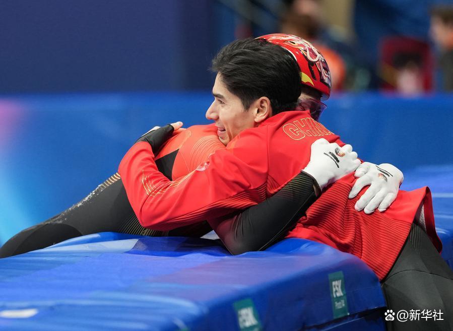 2月12日,孙龙(后)在比赛后和队友刘少昂拥抱。新华社记者 薛宇舸 摄