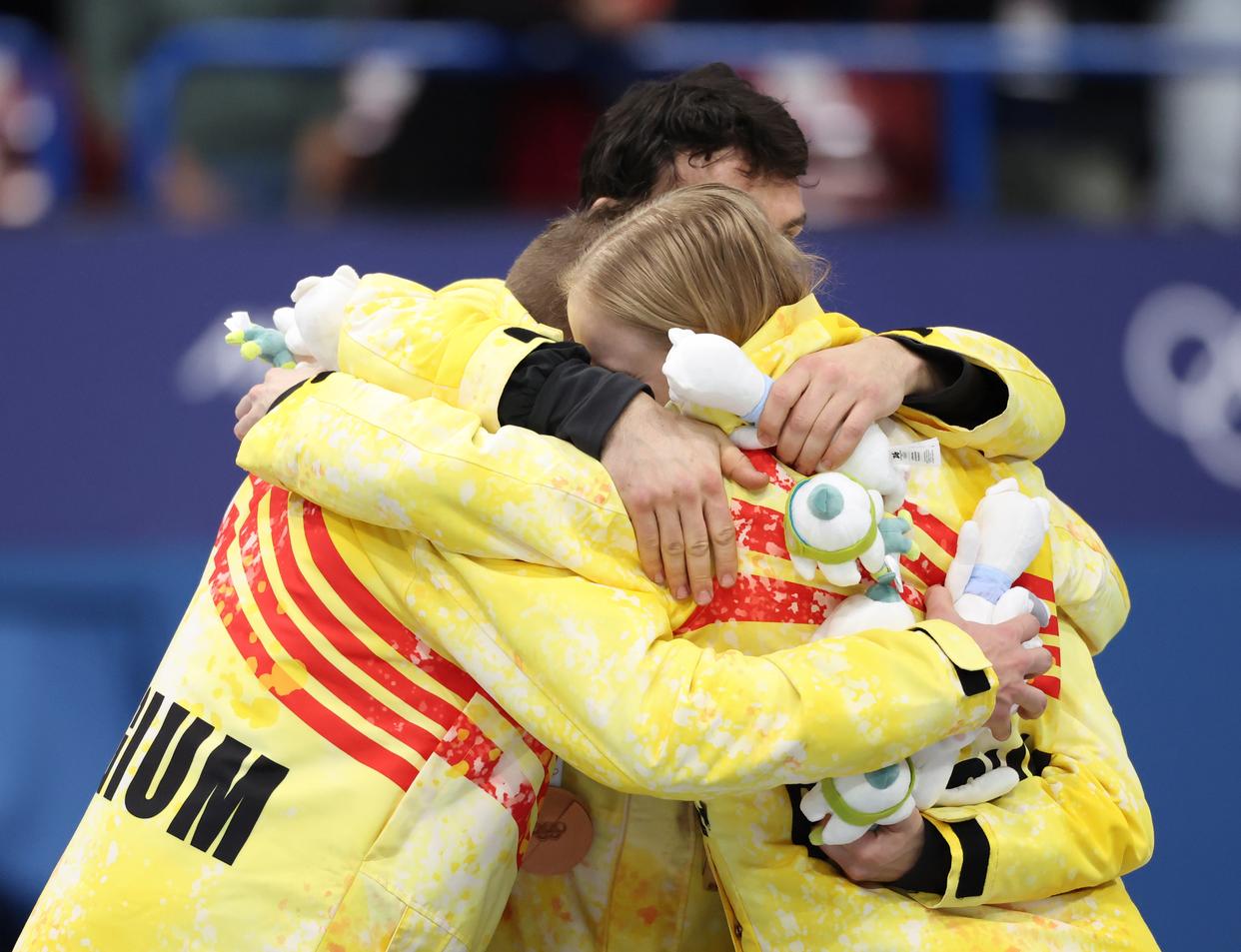 2月10日,季军比利时队在短道速滑混合团体接力颁奖仪式上庆祝。新华社记者 李明 摄