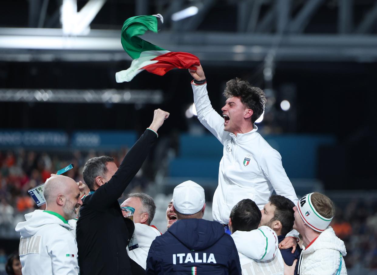 2月8日,季军意大利选手里卡尔多·洛雷洛(上)在速度滑冰男子5000米决赛后庆祝。新华社记者 杜潇逸 摄