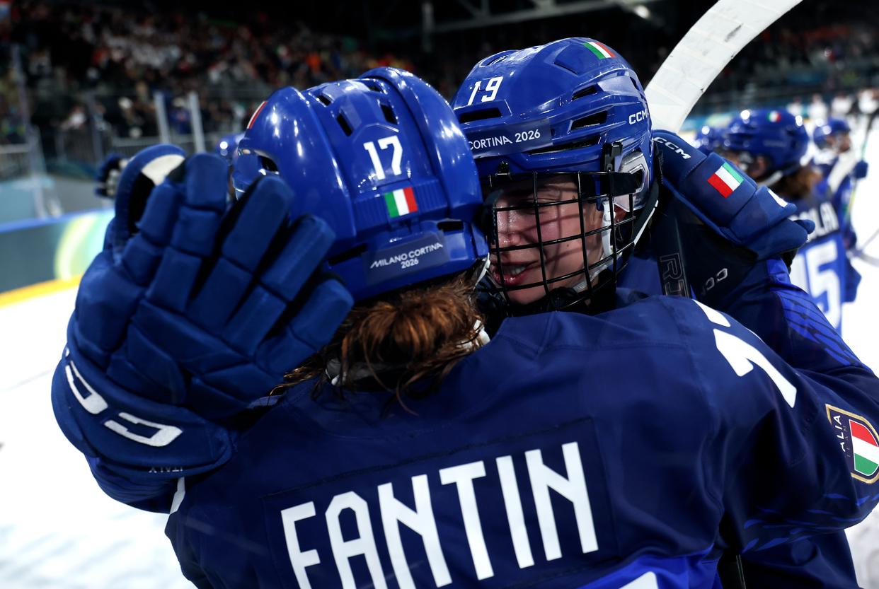 2月9日,意大利队球员克里斯廷·德拉·罗维雷(右)与马蒂尔德·凡廷在冰球项目女子小组赛后庆祝胜利。新华社记者 张铖 摄