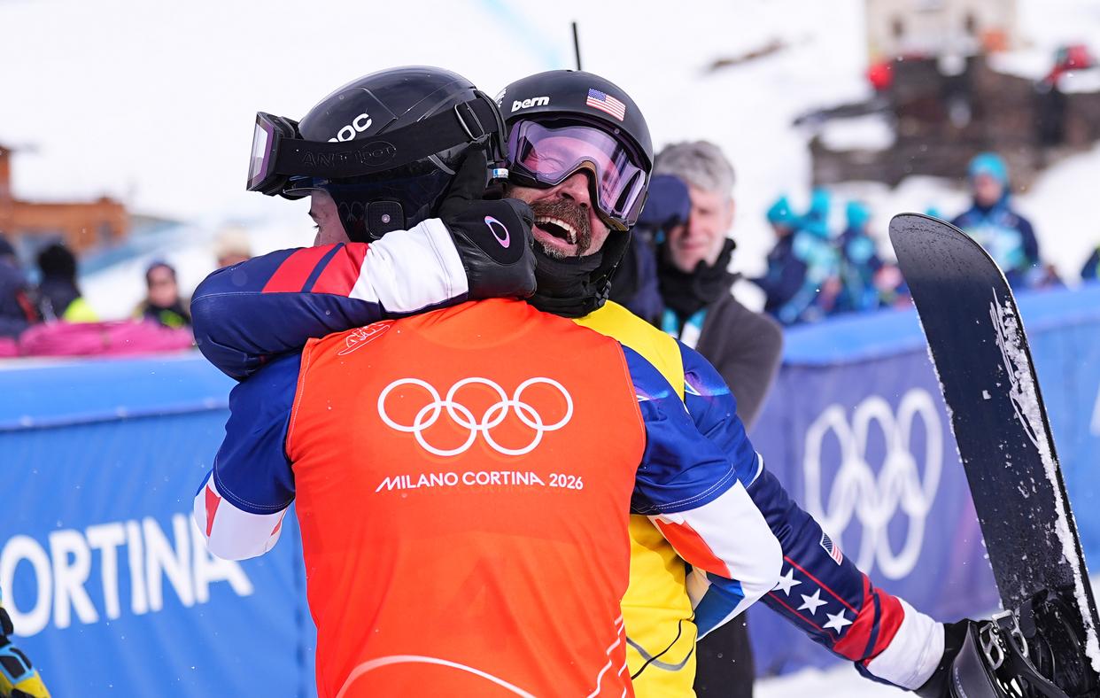 2月12日,美国选手鲍姆格特纳(右)和法国选手肖莱在单板滑雪男子障碍追逐小决赛后拥抱。新华社记者 邬惠我 摄