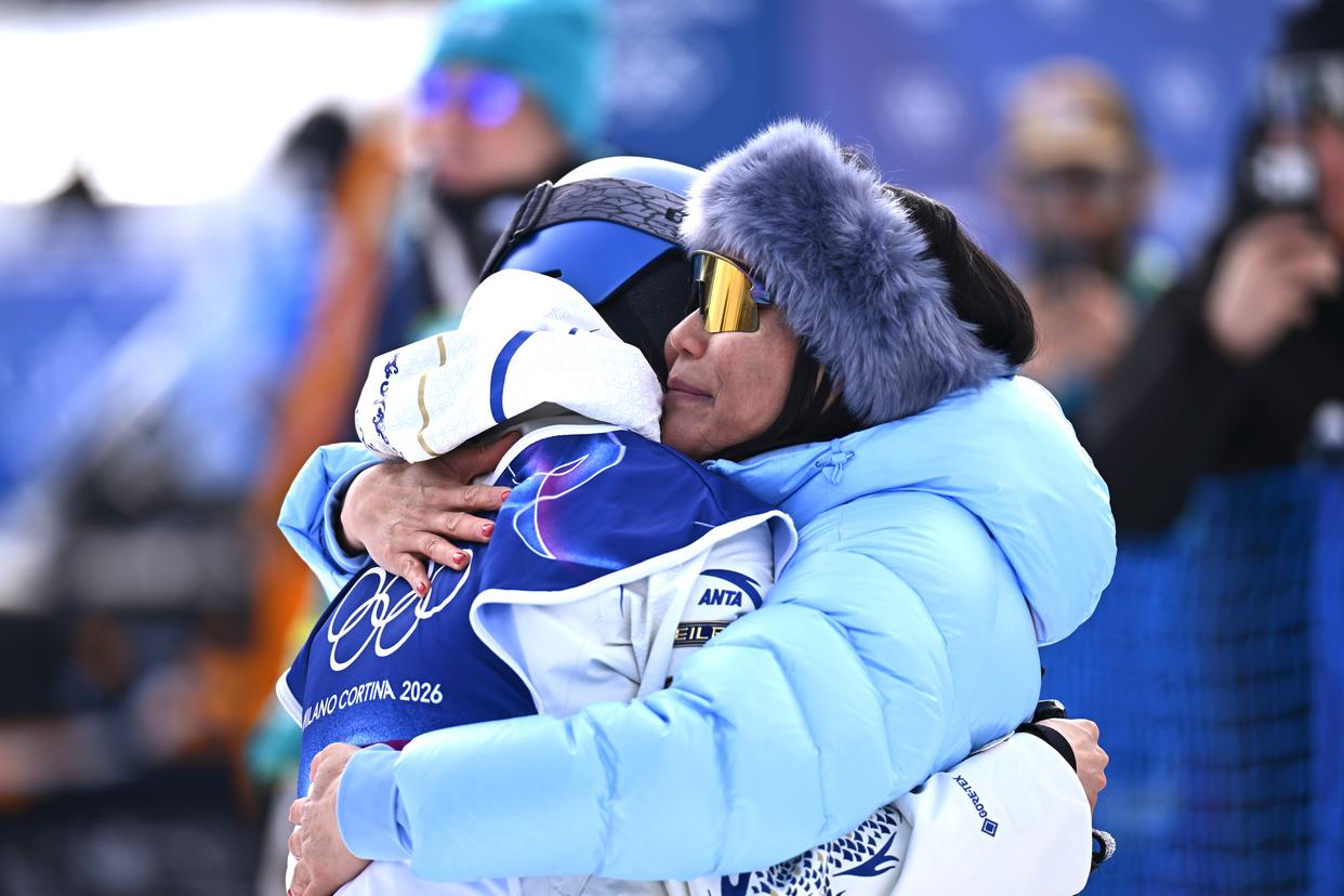 2月9日,中国选手谷爱凌(左)在完成自由式滑雪女子坡面障碍技巧决赛第一跳后和母亲拥抱。新华社记者 张宏祥 摄