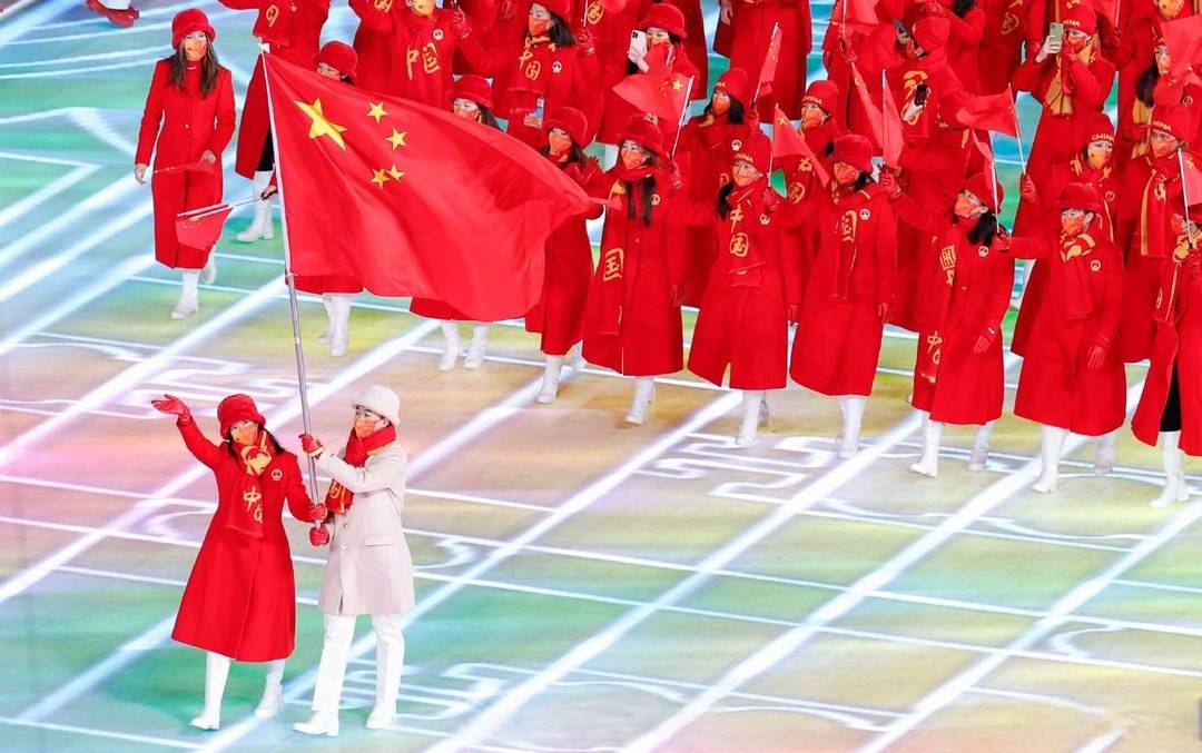 2022年2月4日,北京冬奥会开幕式上,中国钢架雪车运动员赵丹(前排左一)作为中国代表团旗手入场