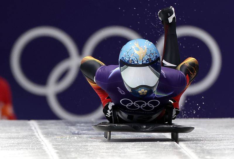 2月13日,中国选手赵丹在冬奥会女子钢架雪车第一轮比赛中出发。(新华社)