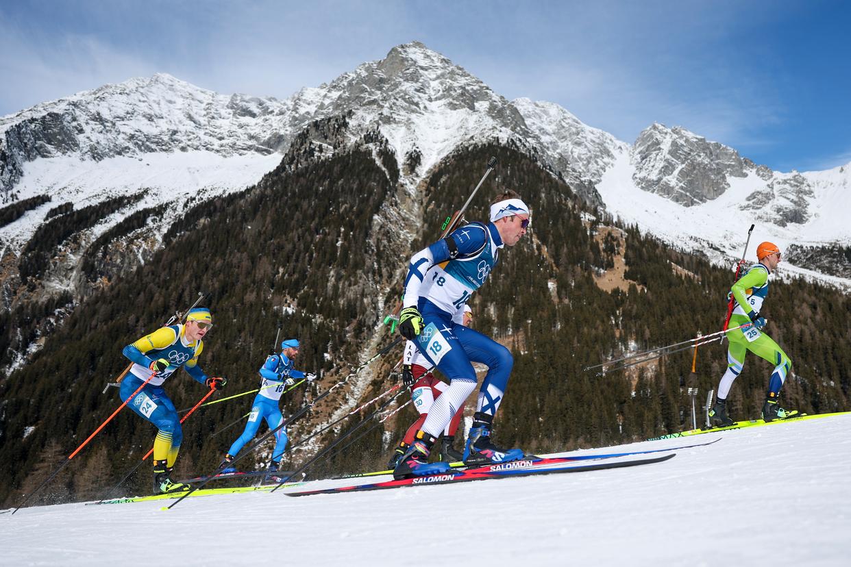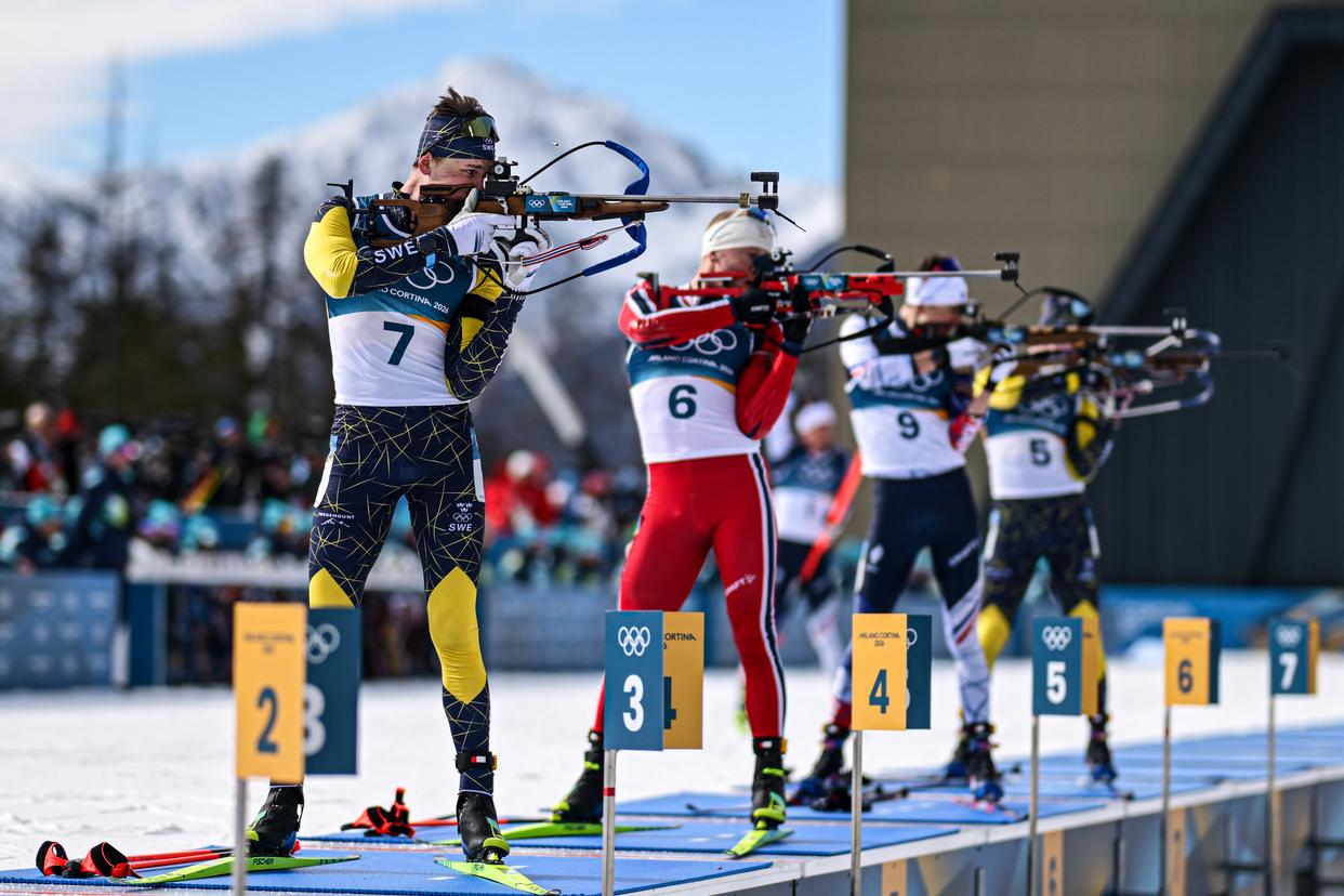 2月15日,瑞典选手蓬西卢奥马(左一)在比赛中。最终,他获得冠军。 当地时间2月15日,米兰-科尔蒂纳冬奥会冬季两项男子12.5公里追逐赛在意大利安泰塞尔瓦举行。 新华社记者 江汉 摄