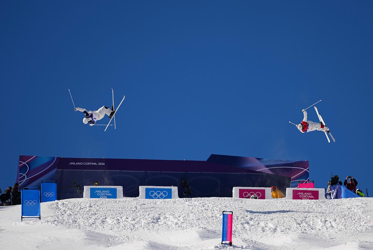 2月15日,加拿大选手金斯伯里(右)和日本选手堀岛行真在大决赛中。他们分别获得金牌和银牌。 当地时间2月15日,米兰-科尔蒂纳冬奥会自由式滑雪男子双人雪上技巧决赛在意大利利维尼奥举行。 新华社记者 邬惠我 摄