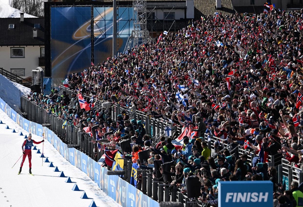 2月15日,挪威队选手克莱博在比赛中即将冲线。 当地时间2月15日,在意大利泰塞罗举行的米兰-科尔蒂纳冬奥会越野滑雪男子4X7.5公里接力比赛中,挪威队夺得冠军,法国队和意大利队分别获得亚军和季军。 新华社记者 贺灿铃 摄