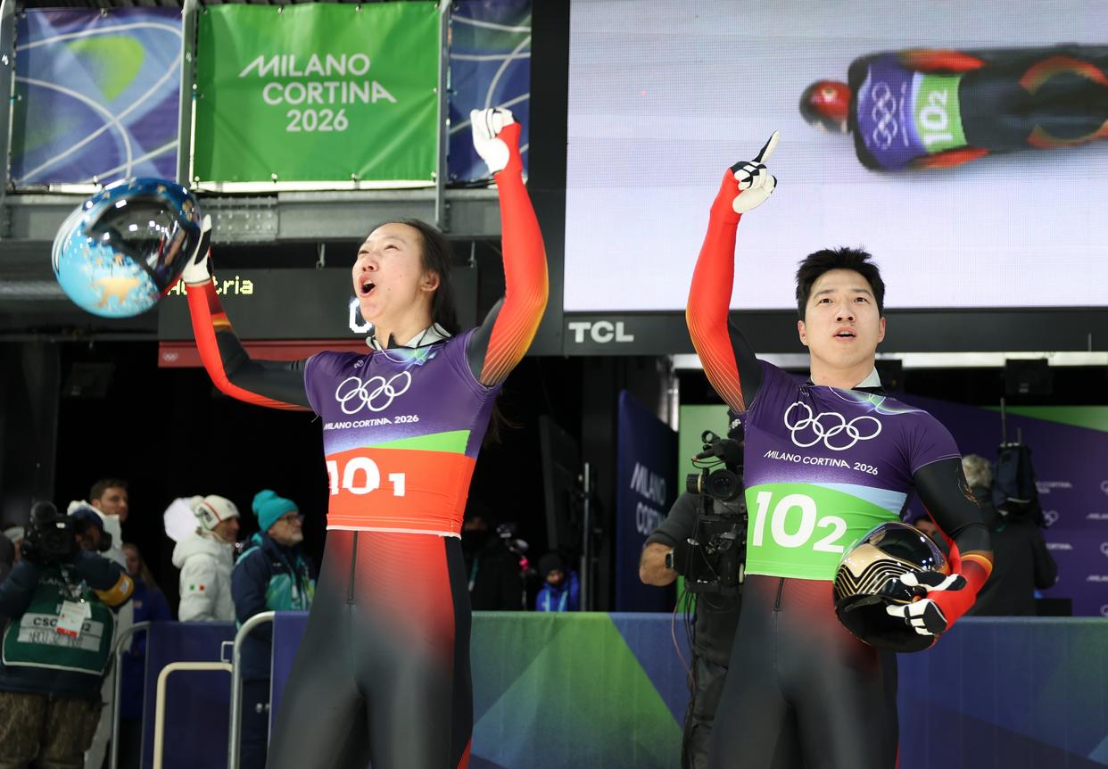 2月15日,中国队组合陈文浩(右)/赵丹在比赛后。他们获得第五名。 当地时间2月15日,米兰-科尔蒂纳冬奥会钢架雪车项目混合团体比赛在意大利科尔蒂纳举行。 新华社记者 丁旭 摄