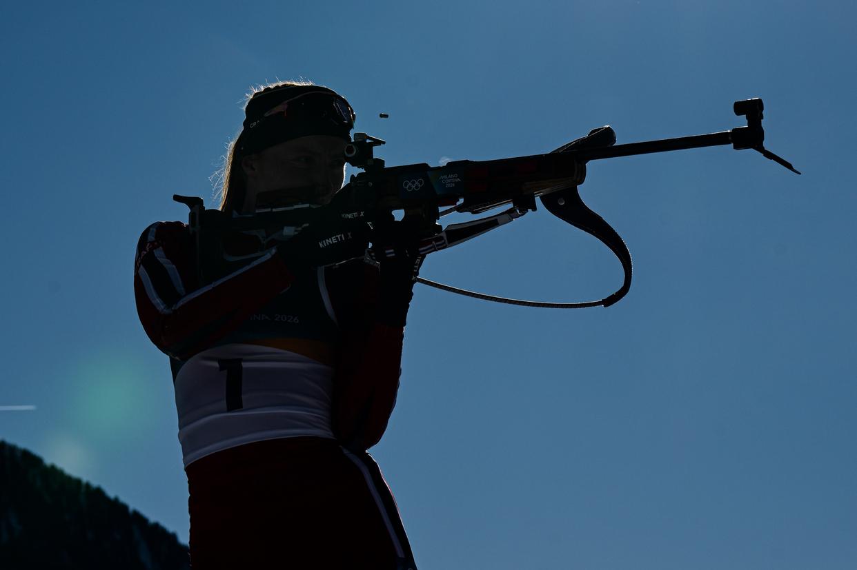 2月15日,挪威选手玛伦在比赛中。她获得亚军。 当地时间2月15日,米兰-科尔蒂纳冬奥会冬季两项女子10公里追逐赛在意大利安泰塞尔瓦举行。 新华社记者 江汉 摄