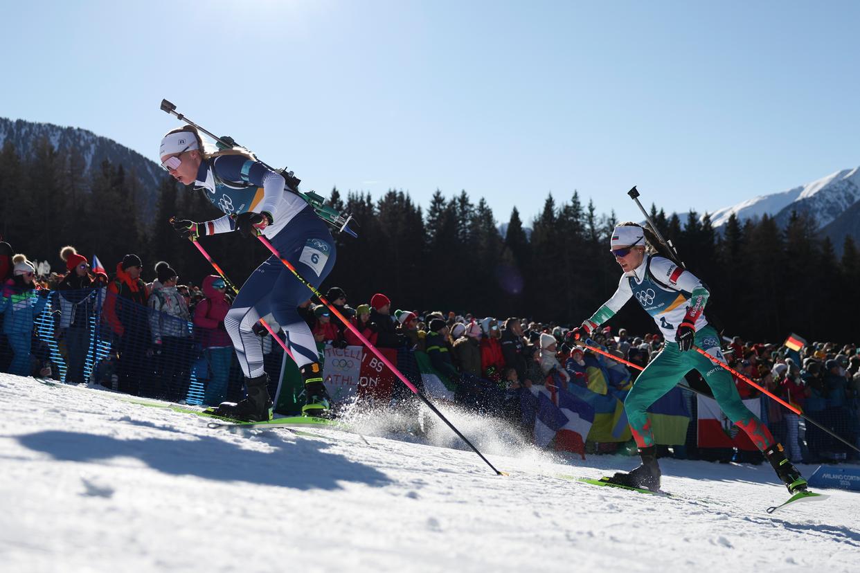 2月15日,芬兰选手苏薇·明基宁(左)在比赛中。她获得季军。 当地时间2月15日,米兰-科尔蒂纳冬奥会冬季两项女子10公里追逐赛在意大利安泰塞尔瓦举行。 新华社记者 张涛 摄