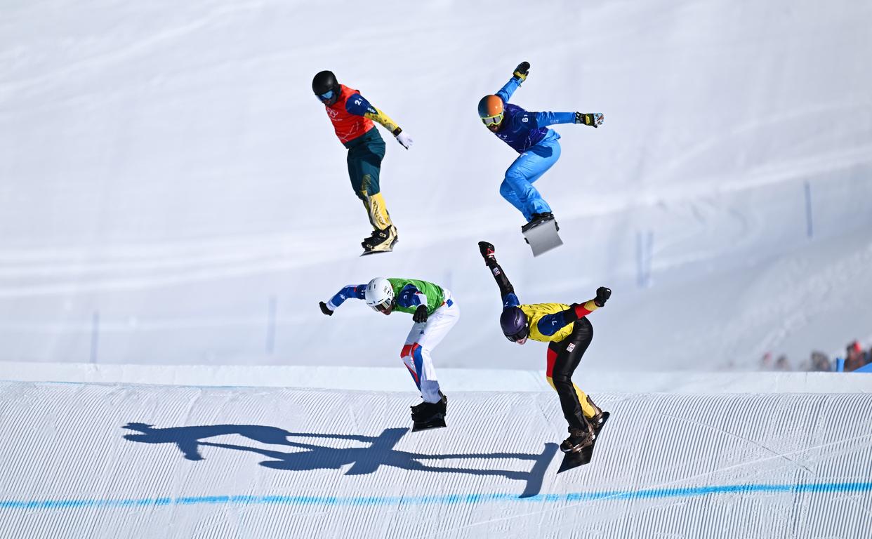 2月15日,意大利1队选手洛伦佐·索马里瓦(右上)在半决赛中。他与搭档米凯拉·莫约利获得亚军。 当地时间2月15日,米兰-科尔蒂纳冬奥会单板滑雪项目障碍追逐混合团体比赛在意大利利维尼奥举行。 新华社记者 张宏祥 摄