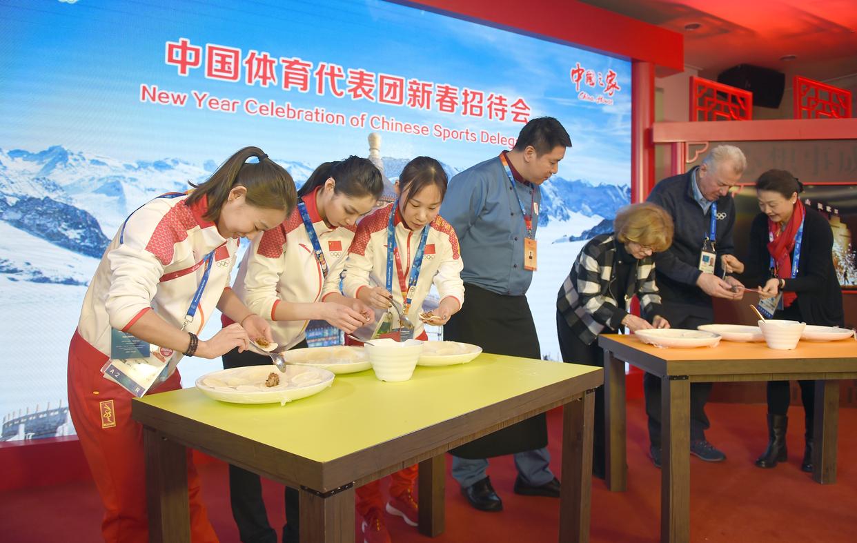 2018年2月15日,部分参加2018平昌冬奥会的中国运动员和嘉宾在中国之家参加包饺子趣味比赛。