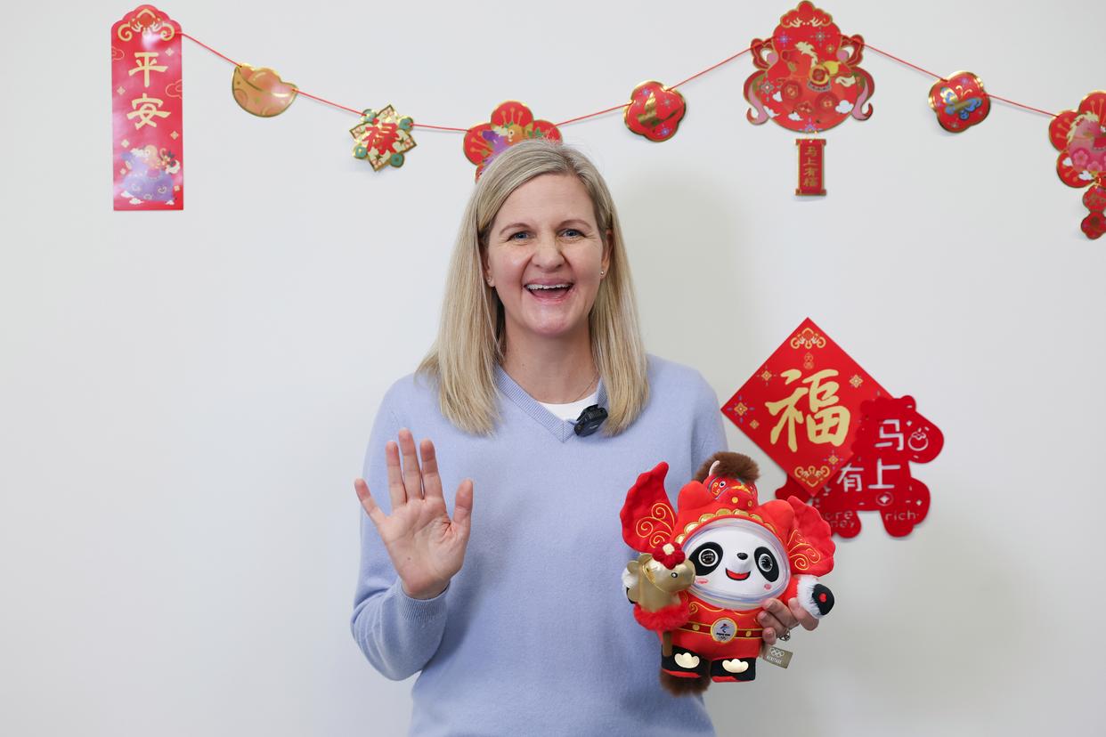 2026年2月13日,国际奥委会主席考文垂在新华社米兰冬奥会报道中心展示“马墩墩”。