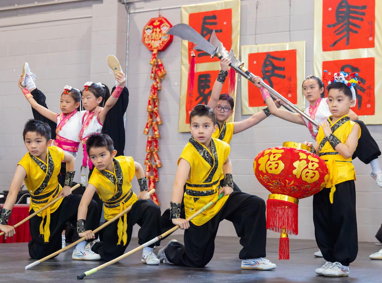 2026年2月15日,在加拿大多伦多举办的春节庙会上,儿童进行武术表演。