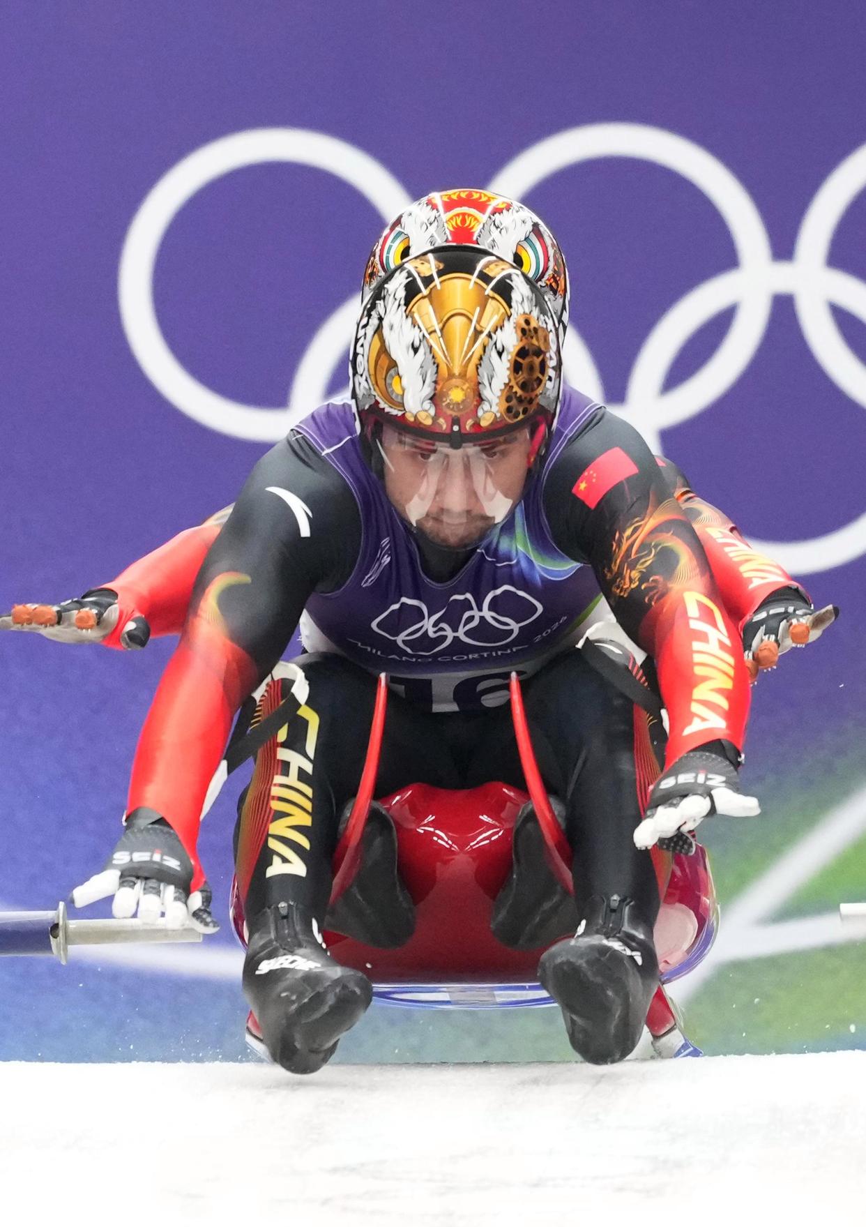 2026年2月11日,居巴依·赛克依(前)/侯硕在雪橇男子双人赛第一轮比赛中。瑞士运动员格雷莫德