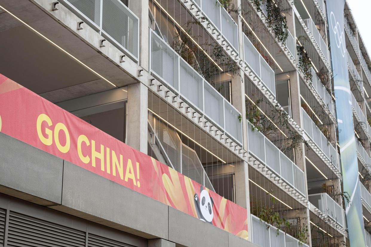 这是2026年2月3日在意大利米兰奥运村拍摄的“中国加油”横幅。
