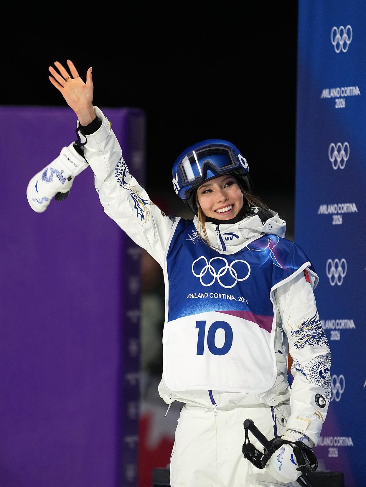 2026年2月7日,在米兰冬奥会自由式滑雪女子坡面障碍技巧资格赛中,谷爱凌在试跳后庆祝。
