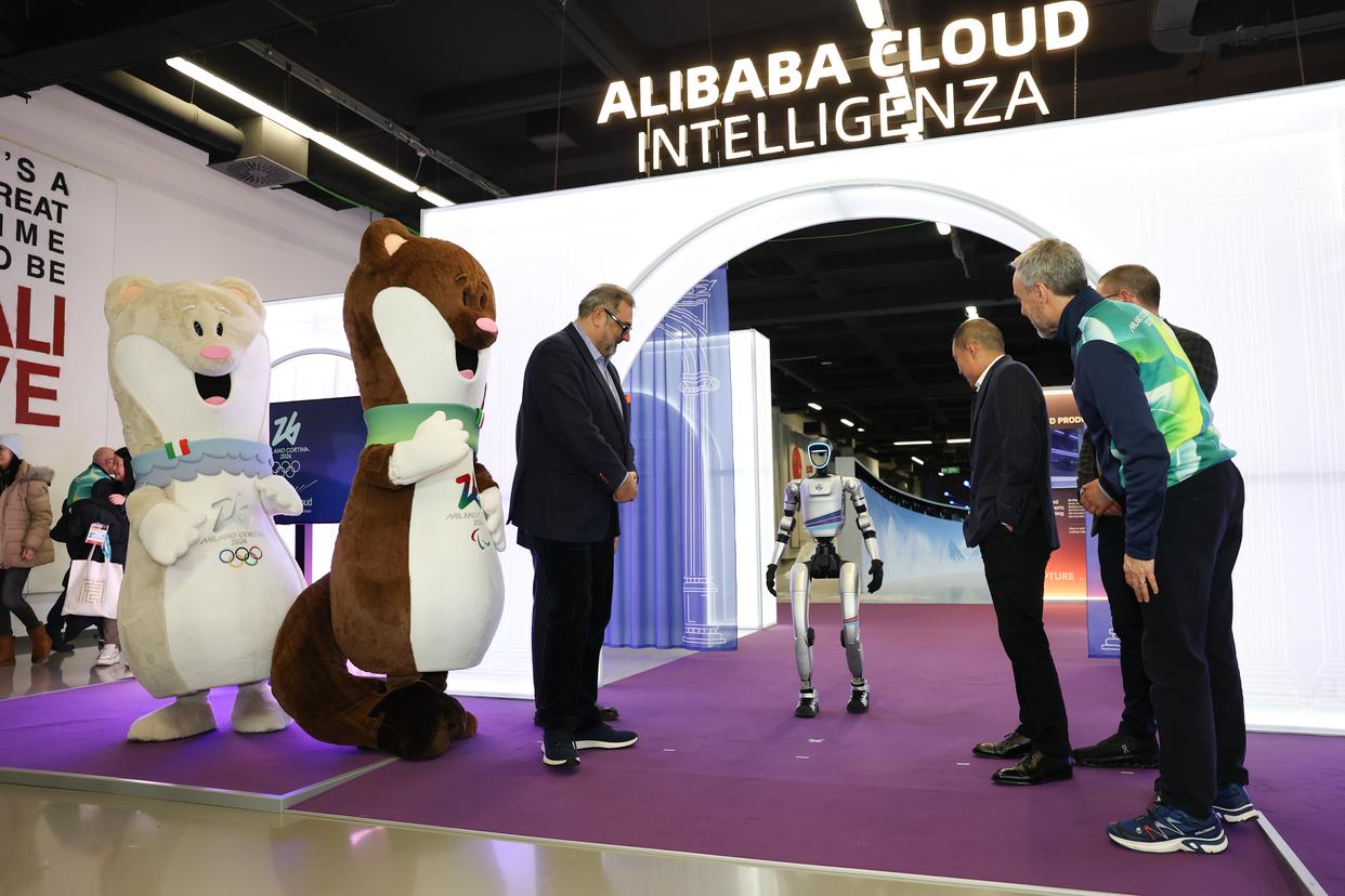 2026年2月4日,嘉宾在阿里千问打造的奥运官方大模型发布会上观看导览机器人。