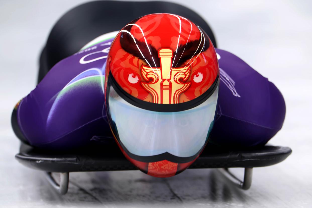 2026年2月12日,殷正在钢架雪车项目男子单人赛第一轮比赛中。