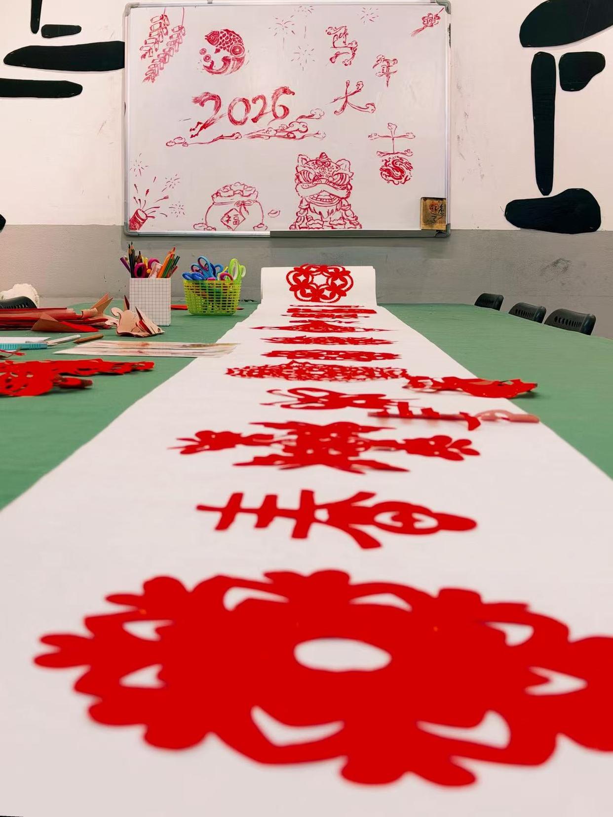 2026年2月14日,在俄罗斯圣彼得堡,当地民众体验剪纸。连日来,世界各地的人们以各种形式迎接即将到来的马年春节。