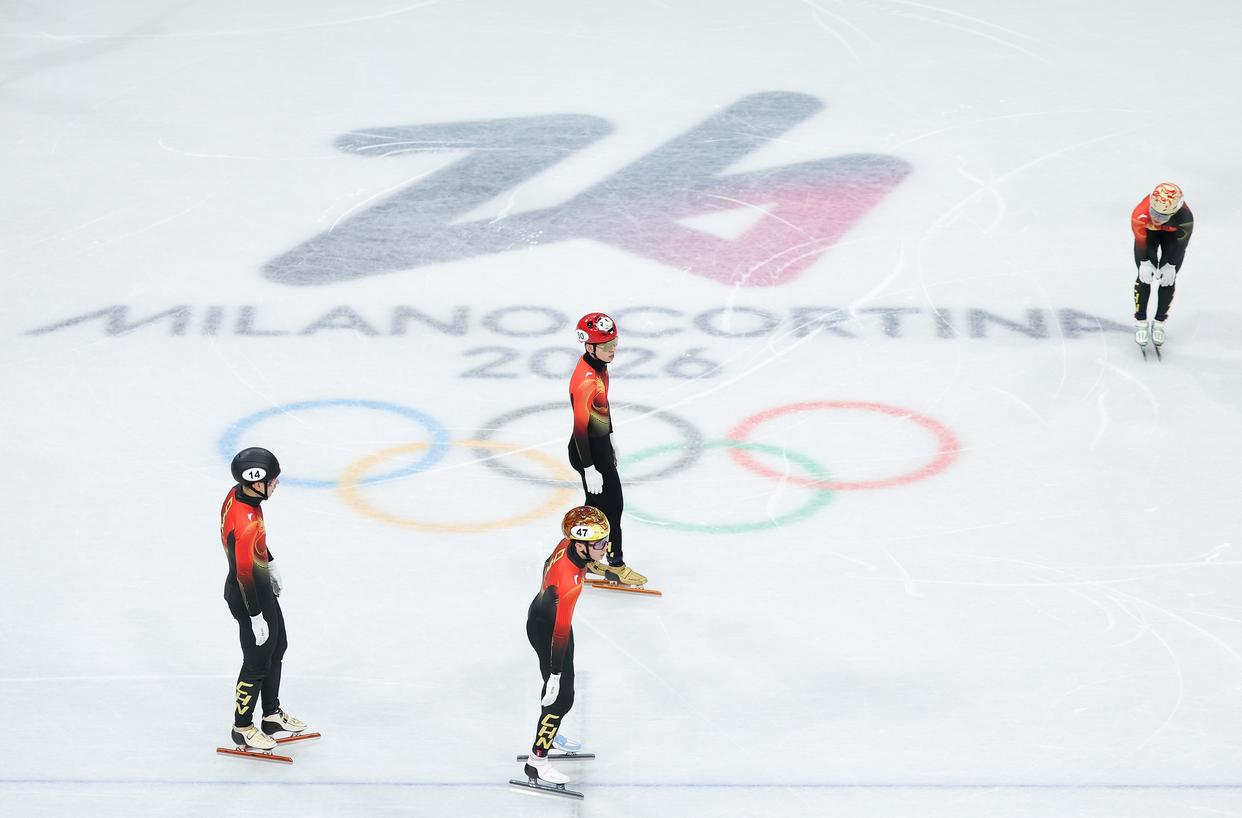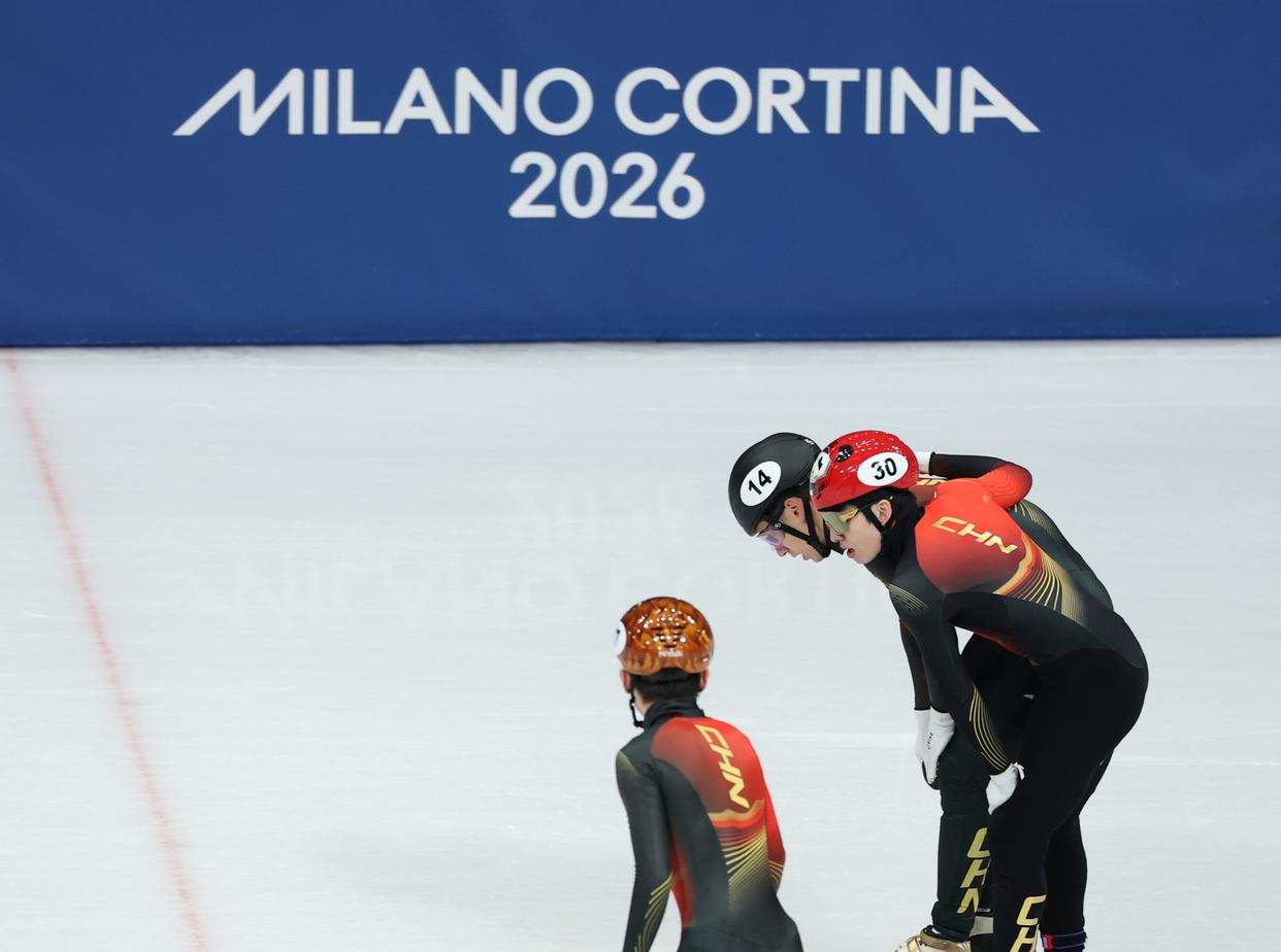 2月16日,中国队选手林孝埈(右一)、刘少昂(右二)、张柏浩在比赛后。 当地时间2月16日,米兰-科尔蒂纳冬奥会短道速滑男子5000米接力半决赛在意大利米兰举行。 新华社记者 李明 摄