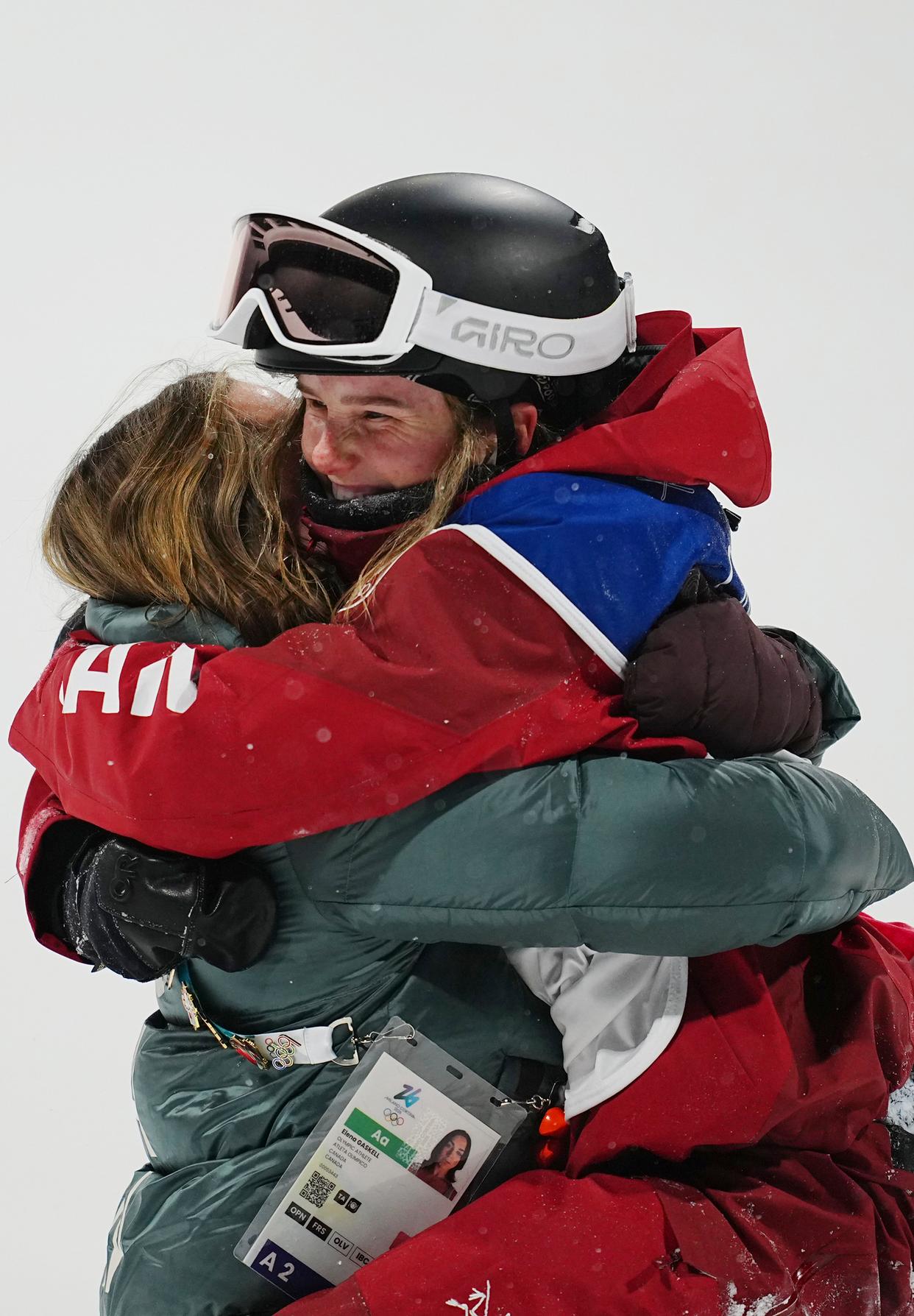 2月16日,加拿大选手梅根·奥尔德姆(右)在比赛后拥抱队友。她获得冠军。 当地时间2月16日,米兰-科尔蒂纳冬奥会自由式滑雪女子大跳台决赛在意大利利维尼奥举行。 新华社记者 胡超 摄