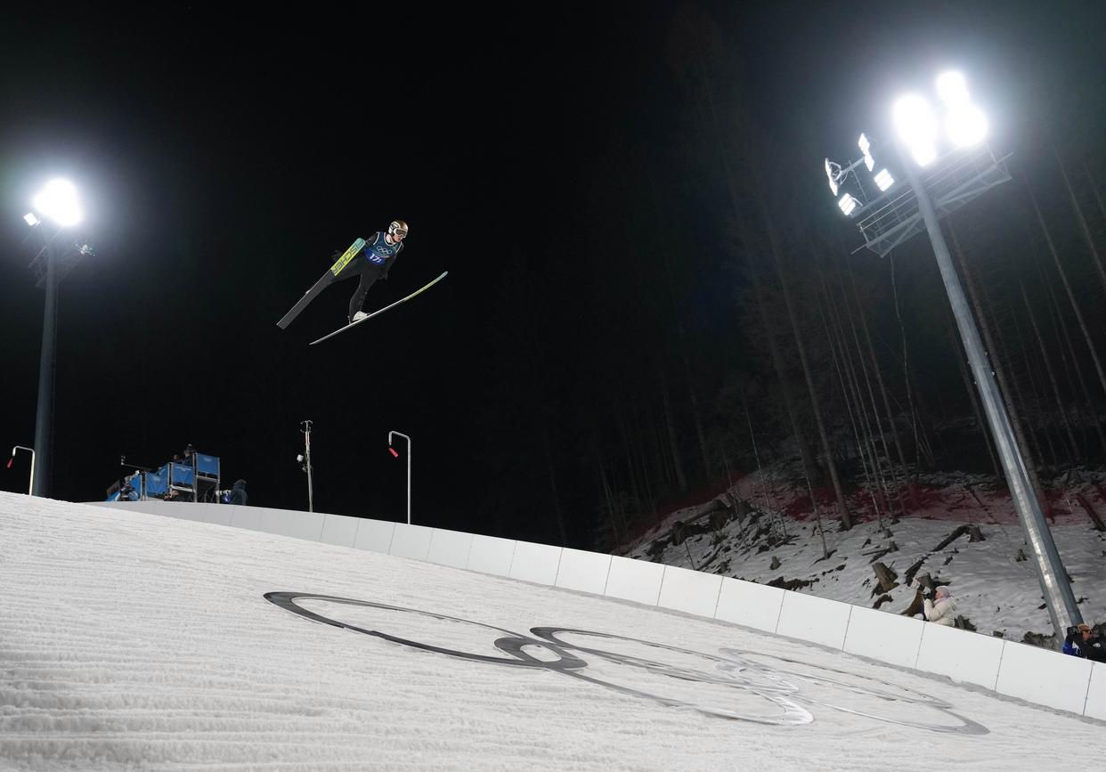2月16日,奥地利队选手斯蒂芬·恩巴赫尔在测试轮比赛中。最终奥地利队获得冠军。 当地时间2月16日,米兰—科尔蒂纳冬奥会跳台滑雪项目男子超级团体比赛在意大利普雷达佐举行。 新华社记者 孟永民 摄