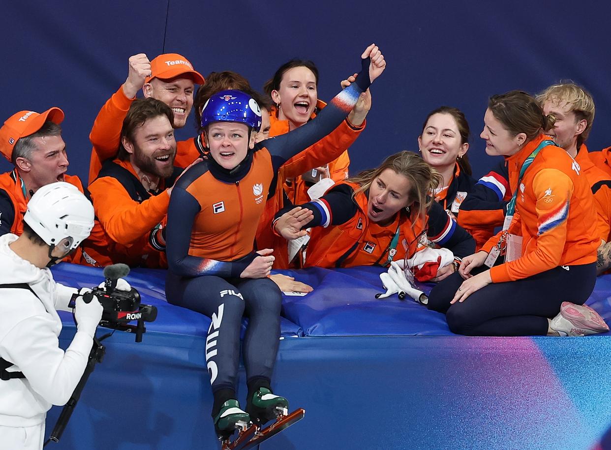 2月16日,荷兰选手桑德拉·贝尔塞伯(前中)在比赛后庆祝。她获得冠军。 当地时间2月16日,米兰-科尔蒂纳冬奥会短道速滑女子1000米决赛在意大利米兰举行。 新华社记者 李明 摄