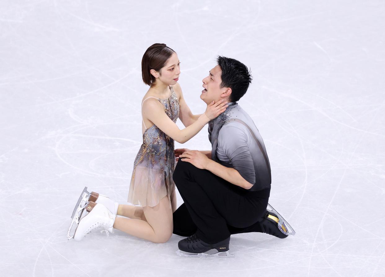 2月16日,日本组合三浦璃来(左)/木原龙一在双人滑自由滑完赛后。最终他们获得双人滑项目冠军。 当地时间2月16日,米兰-科尔蒂纳冬奥会花样滑冰项目双人滑自由滑比赛在意大利米兰举行。 新华社记者 陈益宸 摄