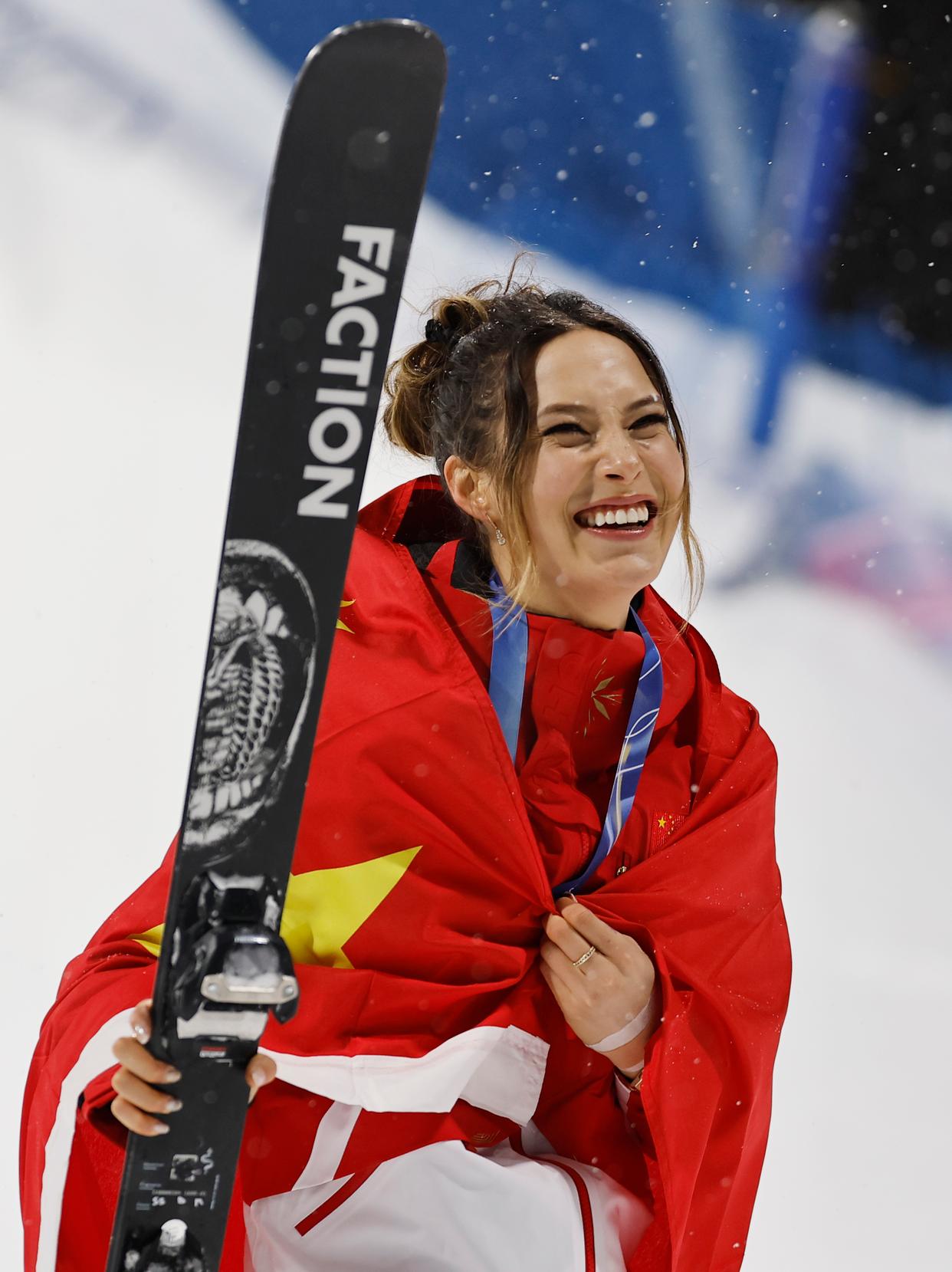 2月16日,中国选手谷爱凌在第三跳后向观众致意。她获得亚军。 当地时间2月16日,米兰-科尔蒂纳冬奥会自由式滑雪女子大跳台决赛在意大利利维尼奥举行。 新华社记者 张宏祥 摄