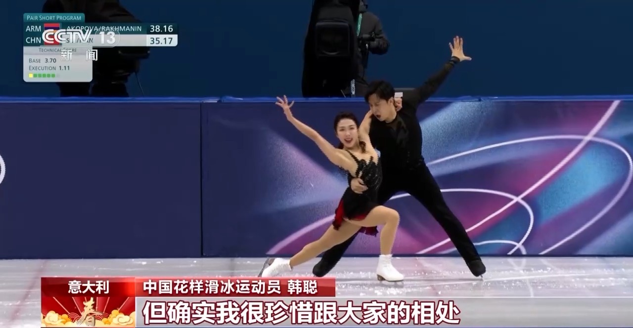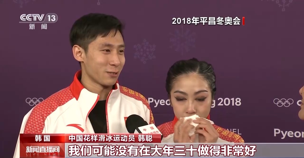 中国花样滑冰运动员韩聪:在感谢所有人之前,要先感谢一下我的搭档。今天说真正意义上的下班。我们就没有机会再在赛场上出现了,以组合的形式。两个人从小长到大包括这半年用了怎么样的心血,站到奥运会的赛场上,获得今天的第五名,觉得我们这一路过来都在今天的这个行礼当中了。