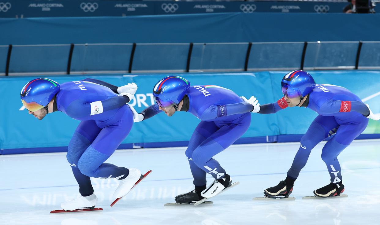 这种“推着滑”的战术并非该项目诞生之初就有。速滑团体追逐项目于2006年都灵冬奥会首次亮相。国际滑联官网显示,夺得首届冬奥会速滑男子团体追逐金牌的意大利队,最初借鉴的是场地自行车的战术,队员们通过频繁变换队形,轮流在队伍最前方领滑破风,大约滑一圈或一圈半后,领滑者会退到队尾休整。