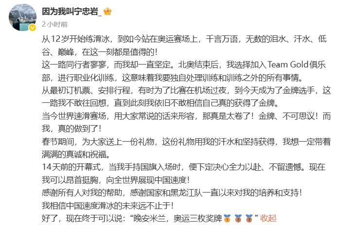 赛后,宁忠岩发文回应:“从12岁开始练滑冰,到如今站在奥运赛场上,千言万语,无数的泪水、汗水、低谷、巅峰,在这一刻都是值得的!”