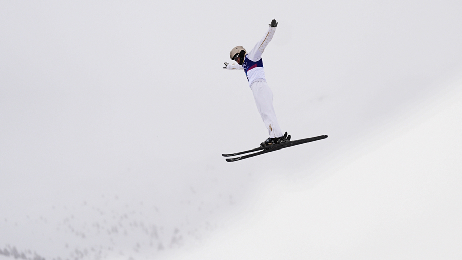 选手王心迪在比赛中。当地时间2月20日,米兰-科尔蒂纳冬奥会自由式滑雪男子空中技巧预赛在意大利利维尼奥举行。新华社记者 邬惠我 摄