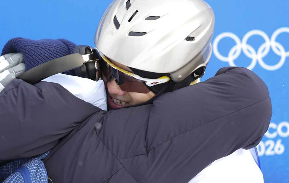 2月20日,王心迪(右)和妻子徐梦桃在比赛中拥抱。当地时间2月20日,在意大利利维尼奥举行的米兰-科尔蒂纳冬奥会自由式滑雪男子空中技巧决赛中,中国选手王心迪和李天马分获冠军和季军。新华社记者邬惠我摄
