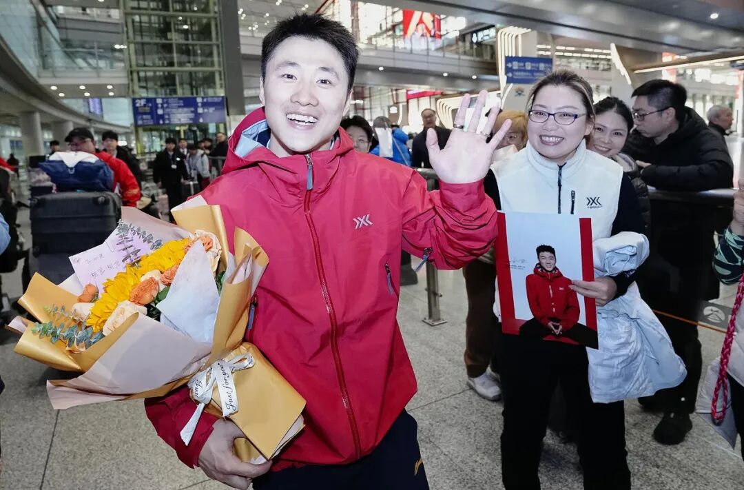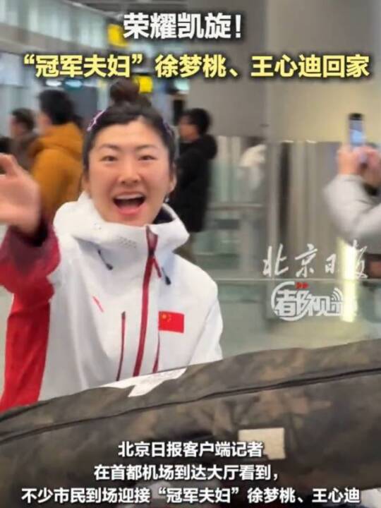 2月24日上午,刚刚在米兰冬奥会双双夺金的“冠军夫妻”徐梦桃与王心迪乘飞机抵达北京首都国际机场。