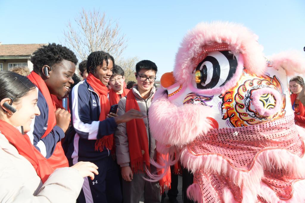 2月20日,中美青少年在河南鹤壁浚县古城与舞狮艺人互动。新华社记者 姜亮 摄