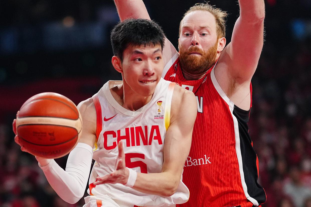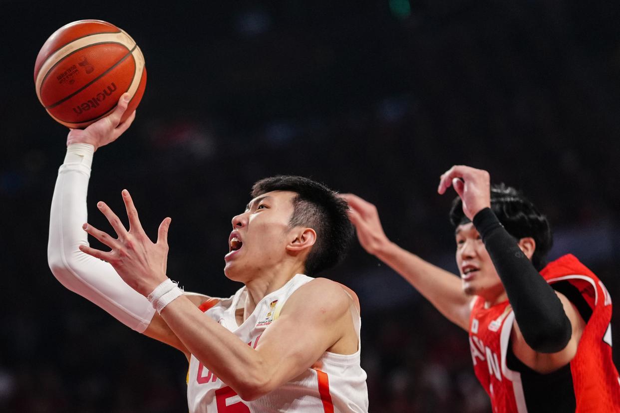 2月26日,中国队球员朱俊龙(上右)在比赛中防守。新华社记者 贾浩成 摄