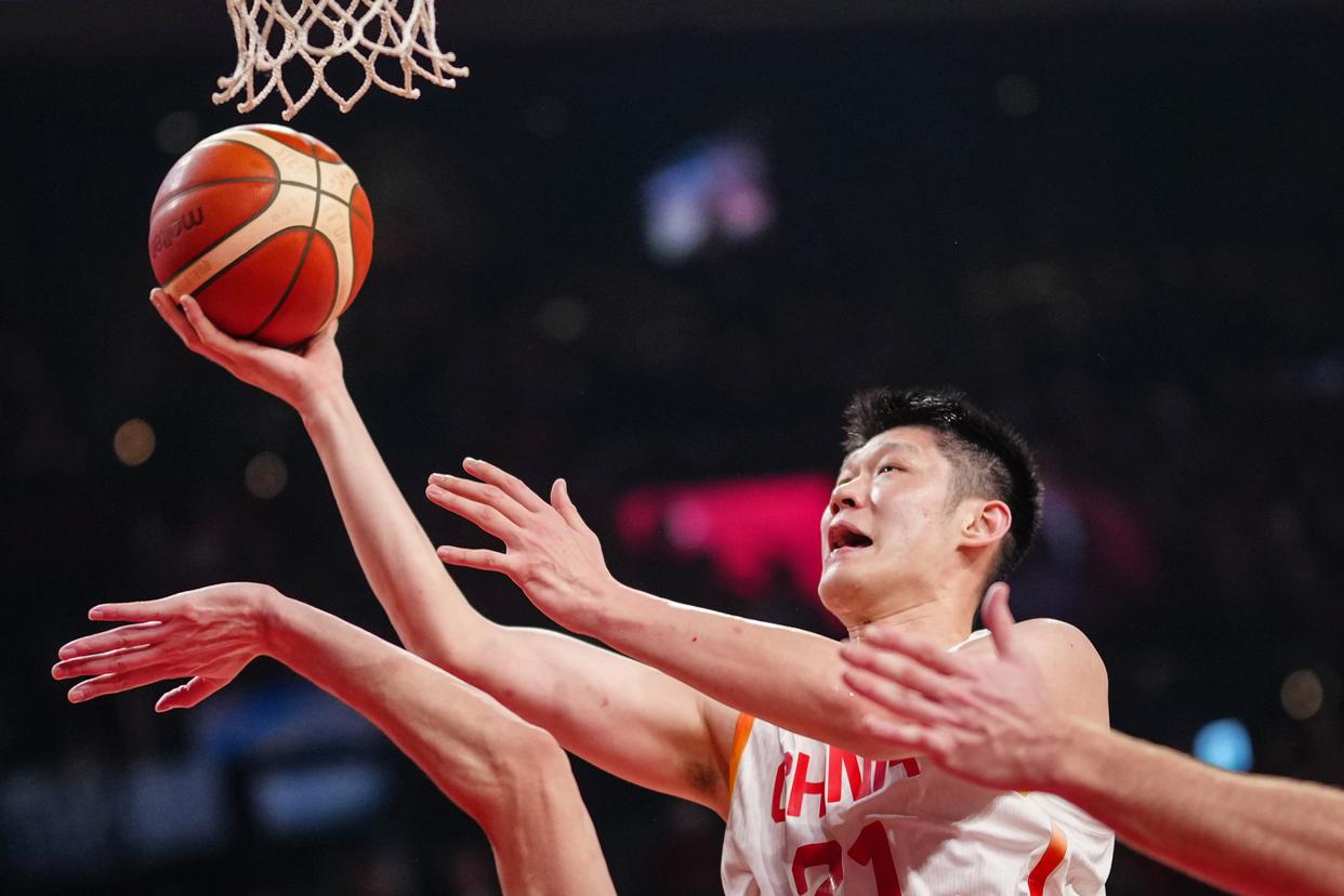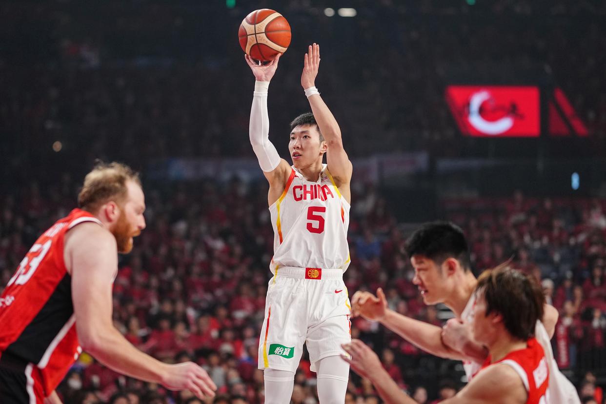 2月26日,中国队球员廖三宁(中)在比赛中投篮。新华社记者 贾浩成 摄